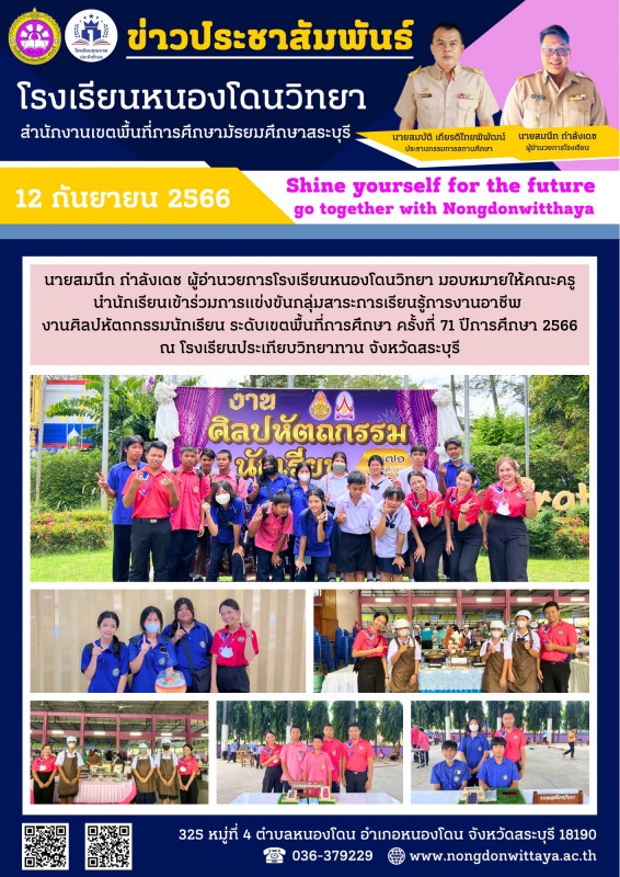 วันที่ 12 กันยายน 2566 นายสมนึก กำลังเดช ผู้อำนวยการโรงเรียนหนองโดนวิทยา มอบหมายให้คณะครูนำนักเรียนเข้าร่วมการแข่งขันกลุ่มสาระการเรียนรู้การงานอาชีพ งานศิลปหัตถกรรมนักเรียน ระดับเขตพื้นที่การศึกษา ครั้งที่ 71 ปีการศึกษา 2566 ณ โรงเรียนประเทียบวิทยาทาน