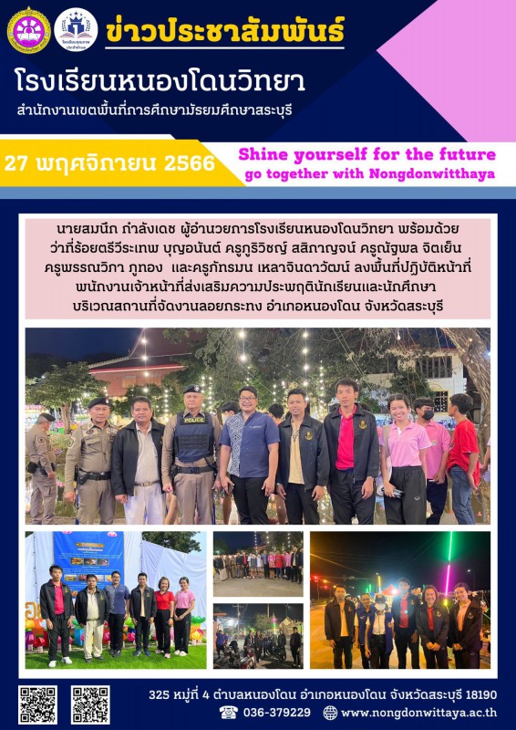 วันที่ 27 พฤศจิกายน 2566 นายสมนึก กำลังเดช ผู้อำนวยการโรงเรียนหนองโดนวิทยา พร้อมด้วยคณะครู ลงพื้นที่ปฏิบัติหน้าที่พนักงานเจ้าหน้าที่ส่งเสริมความประพฤตินักเรียนและนักศึกษา