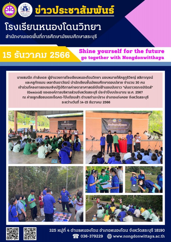 วันที่ 15 ธันวาคม 2566 นักเรียนชั้นมัธยมศึกษาตอนปลาย จำนวน 30 คน เข้าร่วมโครงการอบรมเชิงปฏิบัติการค่ายดาราศาสตร์เปิดฟ้านอนนับดาว "ฝนดาวตกเจมินิดส์"(Geminid) ขององค์การบริหารส่วนจังหวัดสระบุรี ประจําปีงบประมาณ พ.ศ. 2567