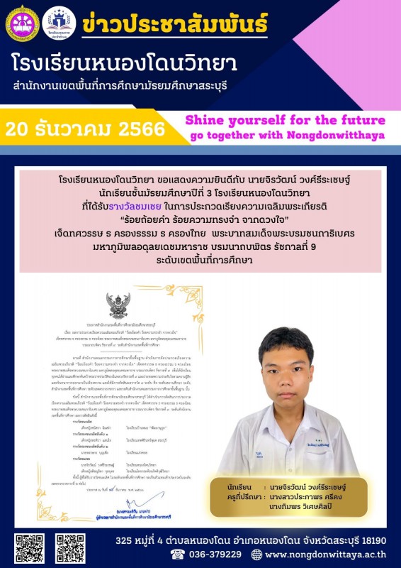 วันที่ 20 ธันวาคม 2566 นายจิรวัฒน์ วงศ์ธีระเชษฐ์ นักเรียนชั้นมัธยมศึกษาปีที่ 3 โรงเรียนหนองโดนวิทยา ได้รับรางวัลชมเชย ในการประกวดเรียงความเฉลิมพระเกียรติ “ร้อยถ้อยคำ ร้อยความทรงจำ จากดวงใจ”