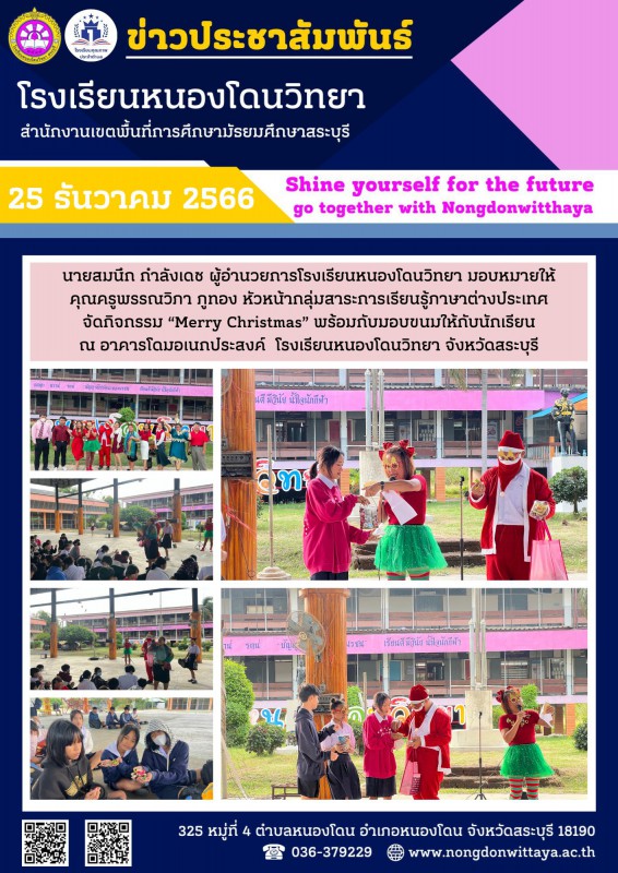 วันที่ 25 ธันวาคม 2566 โรงเรียนหนองโดนวิทยา จัดกิจกรรม “Merry Christmas” พร้อมกับมอบขนมให้กับนักเรียน ณ อาคารโดมอเนกประสงค์ โรงเรียนหนองโดนวิทยา จังหวัดสระบุรี