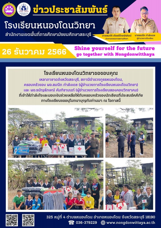 โรงเรียนหนองโดนวิทยาขอขอบคุณหน่วยงานที่เข้าให้กำลังใจและมอบเงินช่วยเหลือให้กับครอบครัวของนักเรียนที่ประสบอัคคีภัย