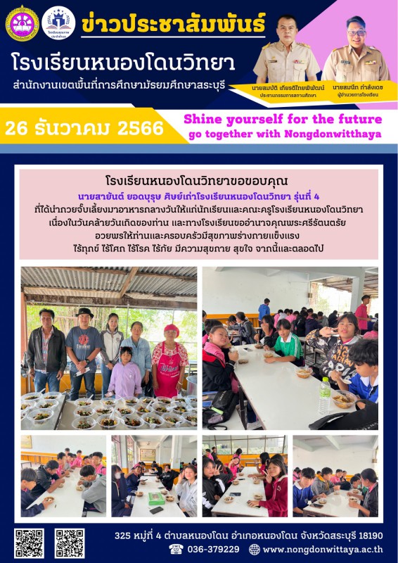 โรงเรียนหนองโดนวิทยาขอขอบคุณ นายสายันต์ ยอดบุรุษ ศิษย์เก่าโรงเรียนหนองโดนวิทยา รุ่นที่ 4 ที่ได้นำกวยจั๊บเลี้ยงมาอาหารกลางวันให้แก่นักเรียนและคณะครู