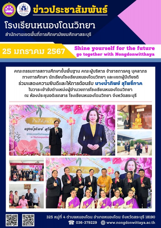 วันที่ 25 มกราคม 2567 โรงเรียนหนองโดนวิทยา และแขกผู้มีเกียรติ ร่วมแสดงความยินดีและให้การต้อนรับนางน้ำทิพย์ สุโพธิ์ภาค ในวาระเข้ารับตำแหน่งผู้อำนวยการโรงเรียนหนองโดนวิทยา ณ ห้องประชุมอดิเรกสาร โรงเรียนหนองโดนวิทยา จังหวัดสระบุรี