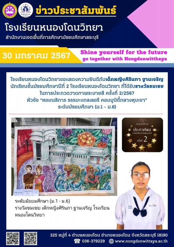 วันที่ 30 มกราคม 2567 โรงเรียนหนองโดนวิทยาขอแสดงความยินดีกับเด็กหญิงศิรินภา ฐานเจริญ นักเรียนชั้นมัธยมศึกษาปีที่ 2 โรงเรียนหนองโดนวิทยา ที่ได้รับรางวัลชมเชย ในการประกวดวาดภาพระบายสี ครั้งที่ 2/2567 หัวข้อ “หอมนสิการ ธรรมะแกลเลอรี คอมมูนิตี้กลางหุบเขา”