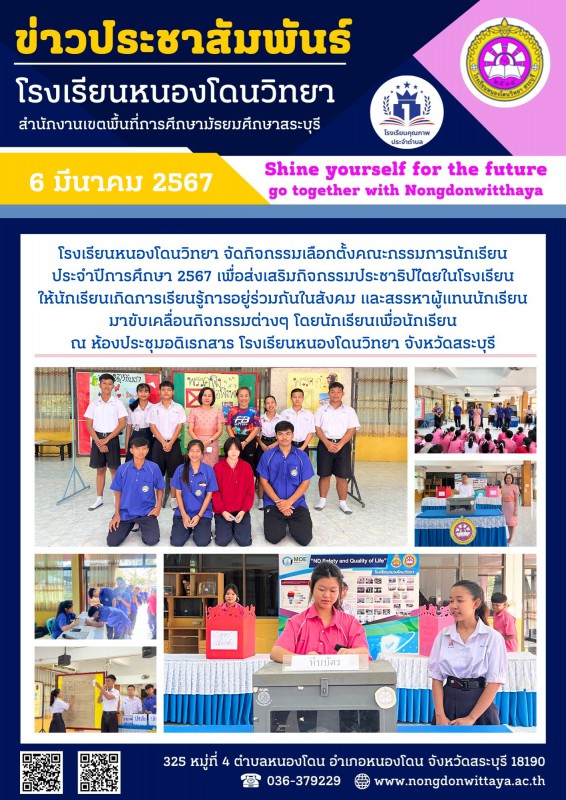 วันที่ 6 มีนาคม 2567 โรงเรียนหนองโดนวิทยา จัดกิจกรรมเลือกตั้งคณะกรรมการนักเรียน ประจำปีการศึกษา 2567