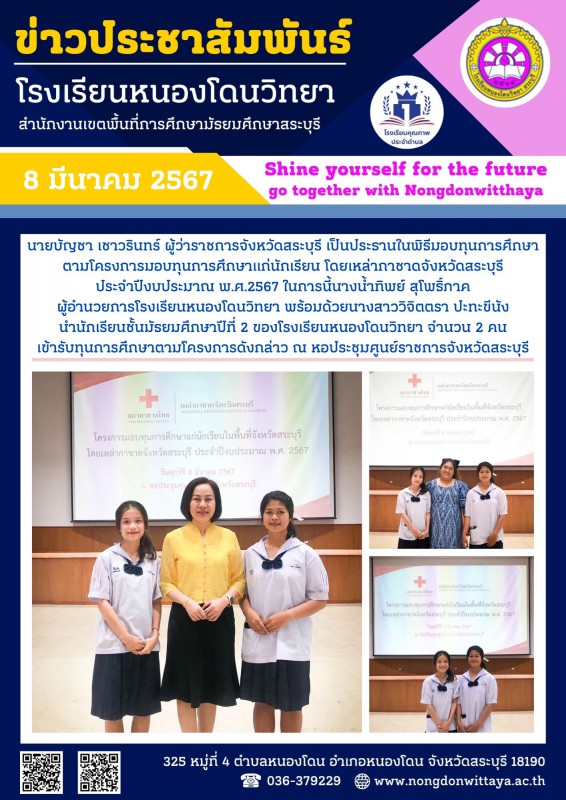 วันที่ 8 มีนาคม 2567 นักเรียนชั้นมัธยมศึกษาปีที่ 2 ของโรงเรียนหนองโดนวิทยา จำนวน 2 คน เข้ารับทุนการศึกษาตามโครงการมอบทุนการศึกษาแก่นักเรียน โดยเหล่ากาชาดจังหวัดสระบุรี ประจำปีงบประมาณ พ.ศ.2567 ณ หอประชุมศูนย์ราชการจังหวัดสระบุรี