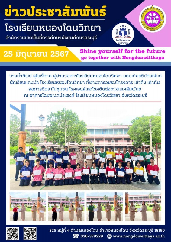 วันที่ 25 มิถุนายน 2567 นางน้ำทิพย์ สุโพธิ์ภาค ผู้อำนวยการโรงเรียนหนองโดนวิทยา มอบเกียรติบัตรให้แก่นักเรียนแกนนำ โรงเรียนหนองโดนวิทยา ที่ผ่านการอบรมโครงการ เข้าถึง เท่าทัน ลดการตีตราในชุมชน โรคเอดส์และโรคติดต่อทางเพศสัมพันธ์