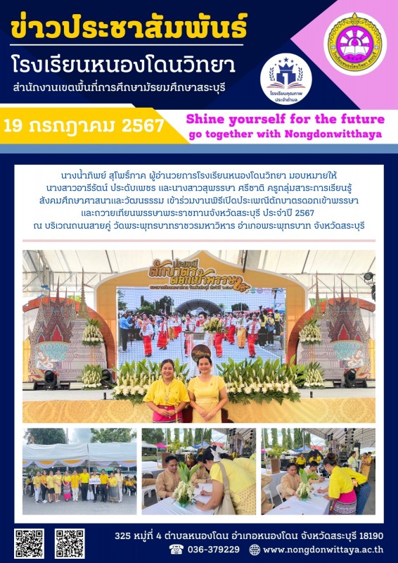 วันที่ 19 กรกฎาคม 2567 เข้าร่วมงานพิธีเปิดประเพณีตักบาตรดอกเข้าพรรษาและถวายเทียนพรรษาพระราชทานจังหวัดสระบุรี ประจำปี 2567 ณ บริเวณถนนสายคู่ วัดพระพุทธบาทราชวรมหาวิหาร อำเภอพระพุทธบาท จังหวัดสระบุรี