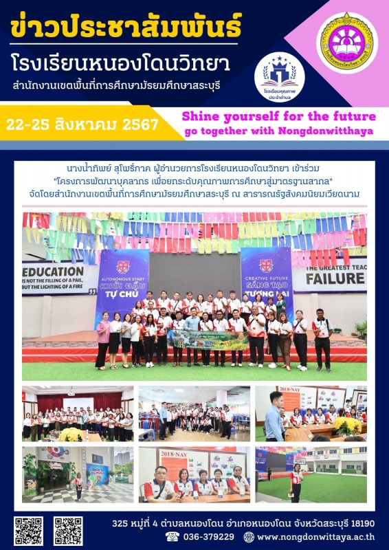 วันที่ 22-25 สิงหาคม 2567 นางน้ำทิพย์ สุโพธิ์ภาค ผู้อำนวยการโรงเรียนหนองโดนวิทยา เข้าร่วม "โครงการพัฒนาบุคลากร เพื่อยกระดับคุณภาพการศึกษาสู่มาตรฐานสากล"