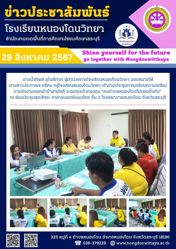 วันที่ 29 สิงหาคม 2567 นางสาวประภาพร ศรีคง ครูโรงเรียนหนองโดนวิทยา เข้าร่วมประชุมการเตรียมความพร้อมการจัดงานทอดผ้าป่าสามัคคี ระดมทุนเข้ากองทุน "คนตำบลหนองโดนไม่ทอดทิ้งกัน"