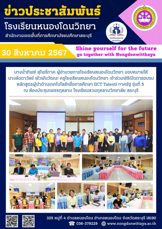 วันที่ 30 สิงหาคม 2567 นางลัดดาวัลย์ พัวพันวัฒนะ ครูโรงเรียนหนองโดนวิทยา เข้าร่วมพิธีเปิดการอบรมหลักสูตรผู้นำด้านเทคโนโลยีเพื่อการศึกษา (ICT Talent) ภาครัฐ รุ่นที่ 5