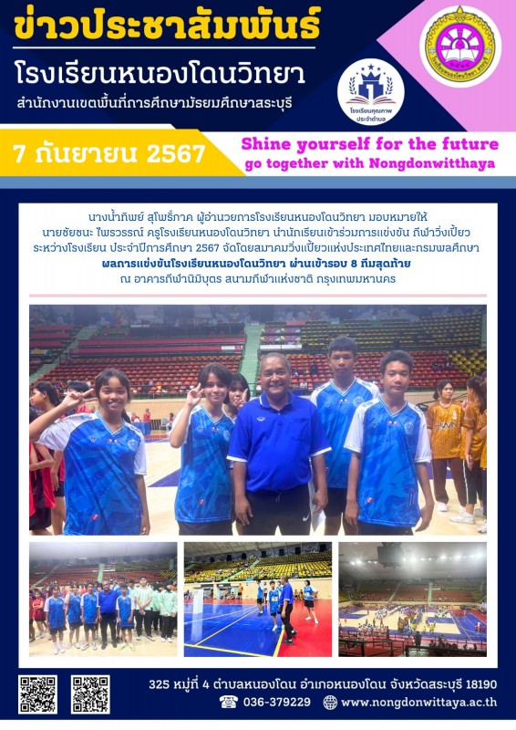 วันที่ 7 กันยายน 2567 นักเรียนโรงเรียนหนองโดนวิทยา เข้าร่วมการแข่งขัน กีฬาวิ่งเปี้ยว ระหว่างโรงเรียน ประจำปีการศึกษา 2567 จัดโดยสมาคมวิ่งเเปี้ยวแห่งประเทศไทยและกรมพลศึกษา ผลการแข่งขันโรงเรียนหนองโดนวิทยา ผ่านเข้ารอบ 8 ทีมสุดท้าย