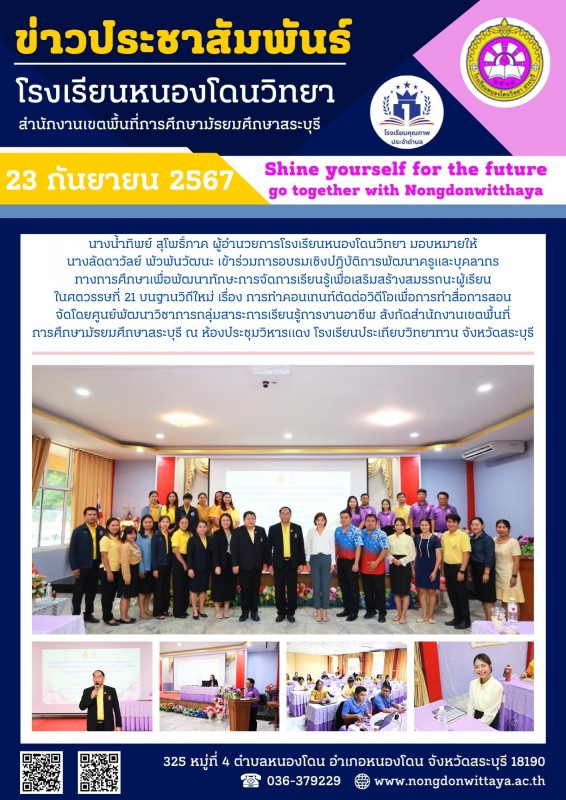 วันที่ 23 กันยายน 2567 นางลัดดาวัลย์ พัวพันวัฒนะ เข้าร่วมการอบรมเชิงปฏิบัติการพัฒนาครูและบุคลากรทางการศึกษาเพื่อพัฒนาทักษะการจัดการเรียนรู้เพื่อเสริมสร้างสมรรถนะผู้เรียนในศตวรรษที่ 21 บนฐานวิถีใหม่ เรื่อง การทำคอนเทนท์ตัดต่อวิดีโอเพื่อการทำสื่อการสอน
