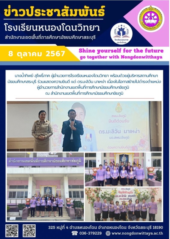 วันที่ 8 ตุลาคม 2567 นางน้ำทิพย์ สุโพธิ์ภาค ผู้อำนวยการโรงเรียนหนองโดนวิทยา พร้อมด้วยผู้บริหารสถานศึกษามัธยมศึกษาสระบุรี ร่วมแสดงความยินดี แด่ ดร.มะลิวัน มาเหง่า เนื่องในโอกาสย้ายไปดำรงตำแหน่งผู้อำนวยการสำนักงานเขตพื้นที่การศึกษามัธยมศึกษาชัยภูมิ ณ สำนัก
