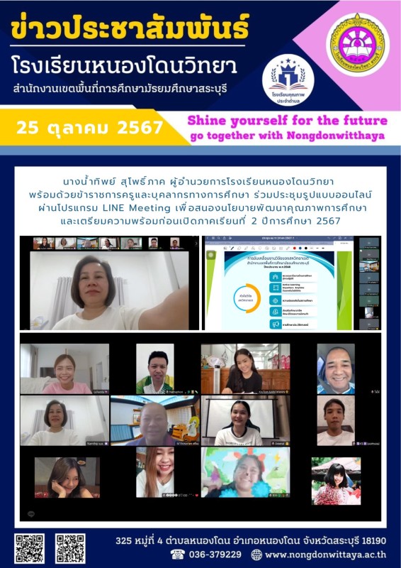 วันที่ 25 ตุลาคม 2567 นางน้ำทิพย์ สุโพธิ์ภาค ผู้อำนวยการโรงเรียนหนองโดนวิทยา พร้อมด้วยข้าราชการครูและบุคลากรทางการศึกษา ร่วมประชุมรูปแบบออนไลน์ ผ่านโปรแกรม LINE Meeting เพื่อสนองนโยบายพัฒนาคุณภาพการศึกษา และเตรียมความพร้อมก่อนเปิดภาคเรียนที่ 2 ปีการศึกษา