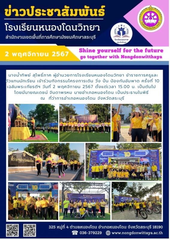 วันที่ 2 พฤศจิกายน 2567 นางน้ำทิพย์ สุโพธิ์ภาค ผู้อำนวยการโรงเรียนหนองโดนวิทยา ข้าราชการครูและตัวแทนนักเรียน เข้าร่วมกิจกรรมโครงการเดิน วิ่ง ปั่น ป้องกันอัมพาต ครั้งที่ 10 เฉลิมพระเกียรติฯ วันที่ 2 พฤศจิกายน 2567 ตั้งแต่เวลา 15.00 น. เป็นต้นไป โดยมีนายณเ