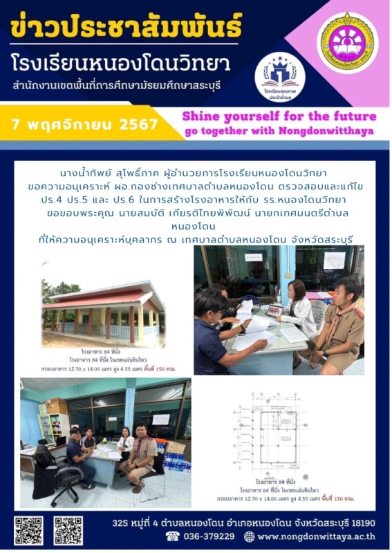วันที่ 7 พฤศจิกายน 2567 นางน้ำทิพย์ สุโพธิ์ภาค ผู้อำนวยการโรงเรียนหนองโดนวิทยา ขอความอนุเคราะห์ ผอ.กองช่างเทศบาลตำบลหนองโดน ตรวจสอบและแก้ไข ปร.4 ปร.5 และ ปร.6 ในการสร้างโรงอาหารให้กับ รร.หนองโดนวิทยา ขอขอบพระคุณ นายสมบัติ ไตรพิพัฒน์ นายกเทศมนตรีตำบลหนองโด