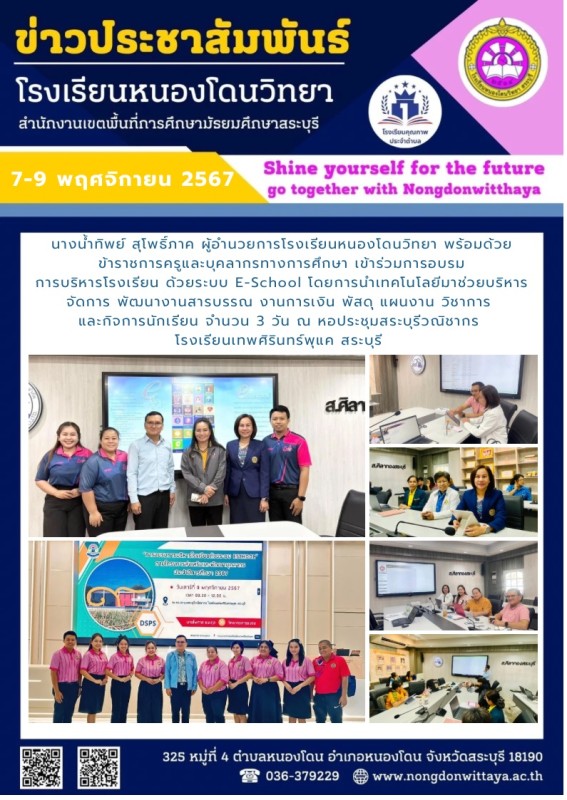 วันที่ 7-9 พฤศจิกายน 2567 นางน้ำทิพย์ สุโพธิ์ภาค ผู้อำนวยการโรงเรียนหนองโดนวิทยา พร้อมด้วยข้าราชการครูและบุคลากรทางการศึกษา เข้าร่วมการอบรมการบริหารโรงเรียน ด้วยระบบ E-School โดยการนำเทคโนโลยีมาช่วยบริหารจัดการ พัฒนางานสารบรรณ งานการเงิน พัสดุ แผนงาน วิชา