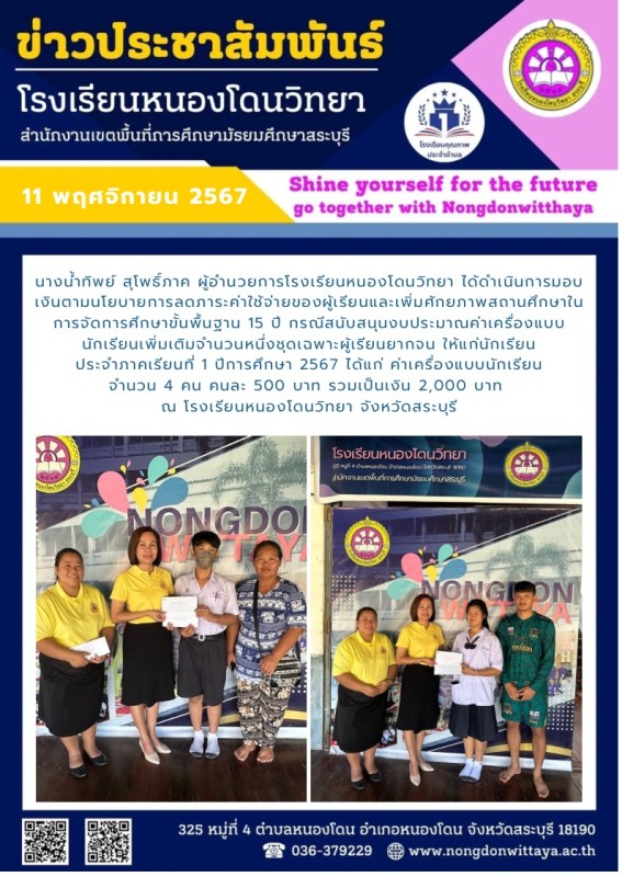 วันที่ 11 พฤศจิกายน 2567 นางน้ำทิพย์ สุโพธิ์ภาค ผู้อำนวยการโรงเรียนหนองโดนวิทยา ได้ดำเนินการมอบเงินตามนโยบายการลดภาระค่าใช้จ่ายของผู้เรียนและเพิ่มศักยภาพสถานศึกษาในการจัดการศึกษาขั้นพื้นฐาน 15 ปี กรณีสนับสนุนงบประมาณค่าเครื่องแบบนักเรียนเพิ่มเติมจำนวนหนึ่