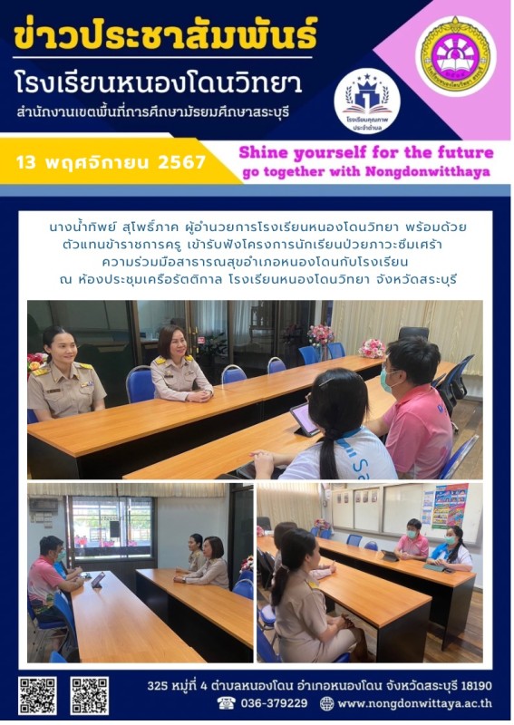 วันที่ 13 พฤศจิกายน 2567 นางน้ำทิพย์ สุโพธิ์ภาค ผู้อำนวยการโรงเรียนหนองโดนวิทยา พร้อมด้วยตัวแทนข้าราชการครู เข้ารับฟังโครงการนักเรียนป่วยภาวะซึมเศร้า ความร่วมมือสาธารณสุขอำเภอหนองโดนกับโรงเรียน ณ ห้องประชุมเครือรัตติกาล โรงเรียนหนองโดนวิทยา จังหวัดสระบุรี
