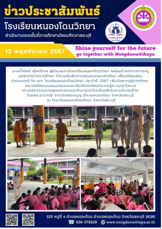 วันที่ 13 พฤศจิกายน 2567 นางน้ำทิพย์ สุโพธิ์ภาค ผู้อำนวยการโรงเรียนหนองโดนวิทยา พร้อมด้วยข้าราชการครู บุคลากรทางการศึกษา ได้ร่วมรับฟังการสอนธรรมมะนักเรียน เพื่อเตรียมสอบ นักธรรมตรี-โท-เอก โรงเรียนหนองโดนวิทยา ประจำปี 2567 เพื่อวัดความรู้การศึกษา พระปริยัต