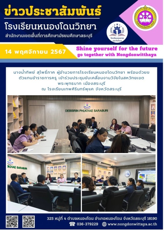 วันที่ 14 พฤศจิกายน 2567 นางน้ำทิพย์ สุโพธิ์ภาค ผู้อำนวยการโรงเรียนหนองโดนวิทยา พร้อมด้วยฃตัวแทนข้าราชการครู เข้าร่วมประชุมขับเคลื่อนงานวิจัยในสหวิทยเขตพระพุทธบาท เมืองสระบุรี ณ โรงเรียนเทพศิรินทร์พุแค จังหวัดสระบุรี