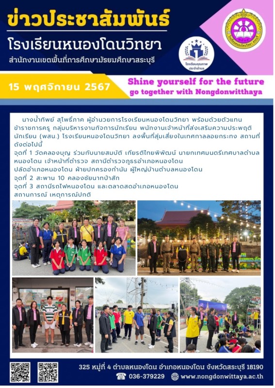 วันที่ 15 พฤศจิกายน 2567 นางน้ำทิพย์ สุโพธิ์ภาค ผู้อำนวยการโรงเรียนหนองโดนวิทยา พร้อมด้วยตัวแทนข้าราชการครู กลุ่มบริหารงานกิจการนักเรียน พนักงานเจ้าหน้าที่ส่งเสริมความประพฤตินักเรียน (พสน.) โรงเรียนหนองโดนวิทยา ลงพื้นที่สุ่มเสี่ยงในเทศกาลลอยกระทง สถานที่ด
