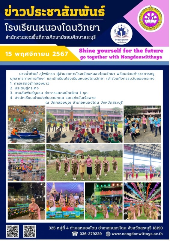 วันที่ 15 พฤศจิกายน 2567 นางน้ำทิพย์ สุโพธิ์ภาค ผู้อำนวยการโรงเรียนหนองโดนวิทยา พร้อมด้วยข้าราชการครู บุคลากรทางการศึกษา และนักเรียนโรงเรียนหนองโดนวิทยา เข้าร่วมกิจกรรมวันลอยกระทง 1. การแสดงรำกลองยาว 2. ประดิษฐ์กระทง 3. สานสัมพันธ์ชุมชน ส่งการแสดงนักเรียน