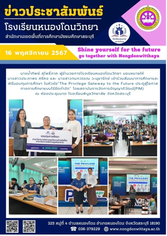 วันที่ 16 พฤศจิกายน 2567 นางน้ำทิพย์ สุโพธิ์ภาค ผู้อำนวยการโรงเรียนหนองโดนวิทยา มอบหมายให้ นางสาวประภาพร ศรีคง และ นางสาวกนกวรรณ วะนุยารักษ์ เข้าร่วมสัมมนาการศึกษาและพิธีมอบทุนการศึกษา ในหัวข้อ”The Privilege Gateway to the Future ประตูสู่โอกาสทางการศึกษาแ