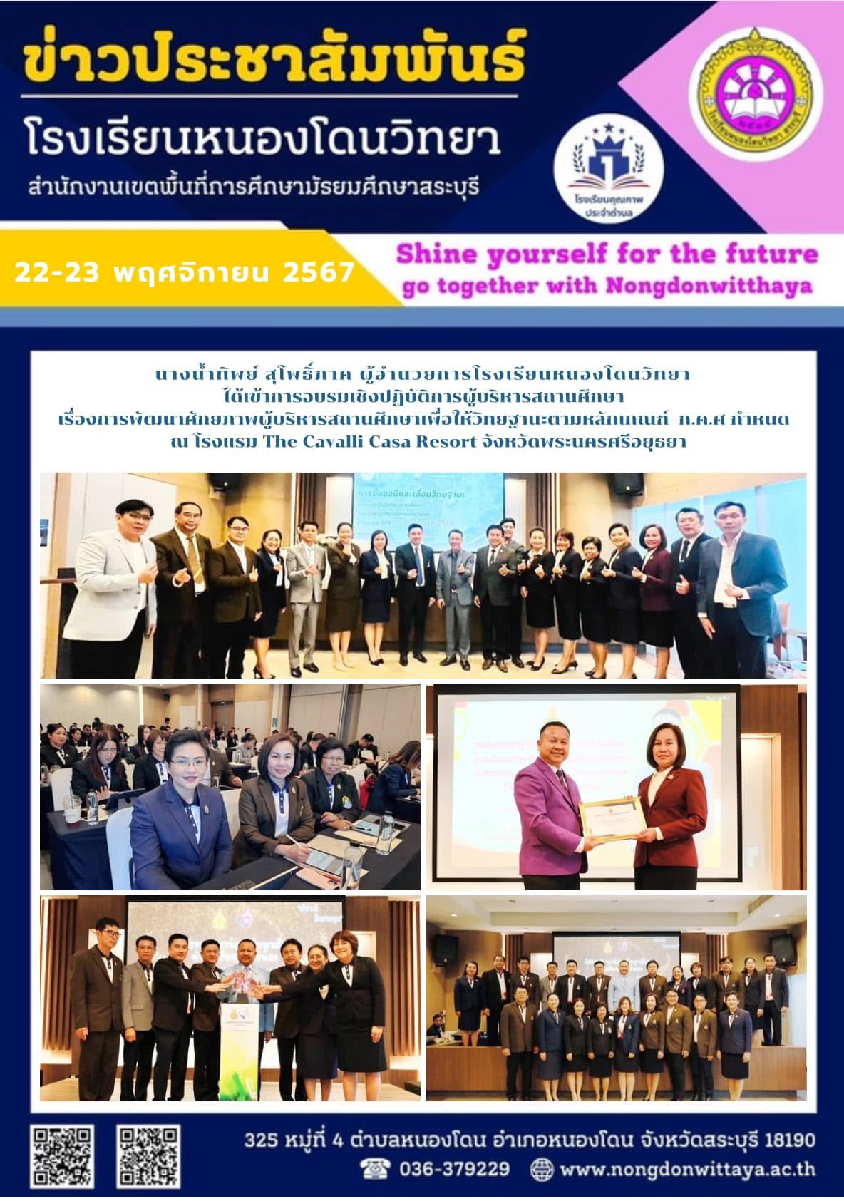 วันที่ 22-23 พฤศจิกายน 2567 นางน้ำทิพย์ สุโพธิ์ภาค ผู้อำนวยการโรงเรียนหนองโดนวิทยา ได้เข้าการอบรมเชิงปฏิบัติการผู้บริหารสถานศึกษา เรื่องการพัฒนาศักยภาพผู้บริหารสถานศึกษาเพื่อให้วิทยฐานะตามหลักเกณฑ์ ก.ค.ศ กำหนด ณ โรงแรม The Cavalli Casa Resort จังหวัดพร