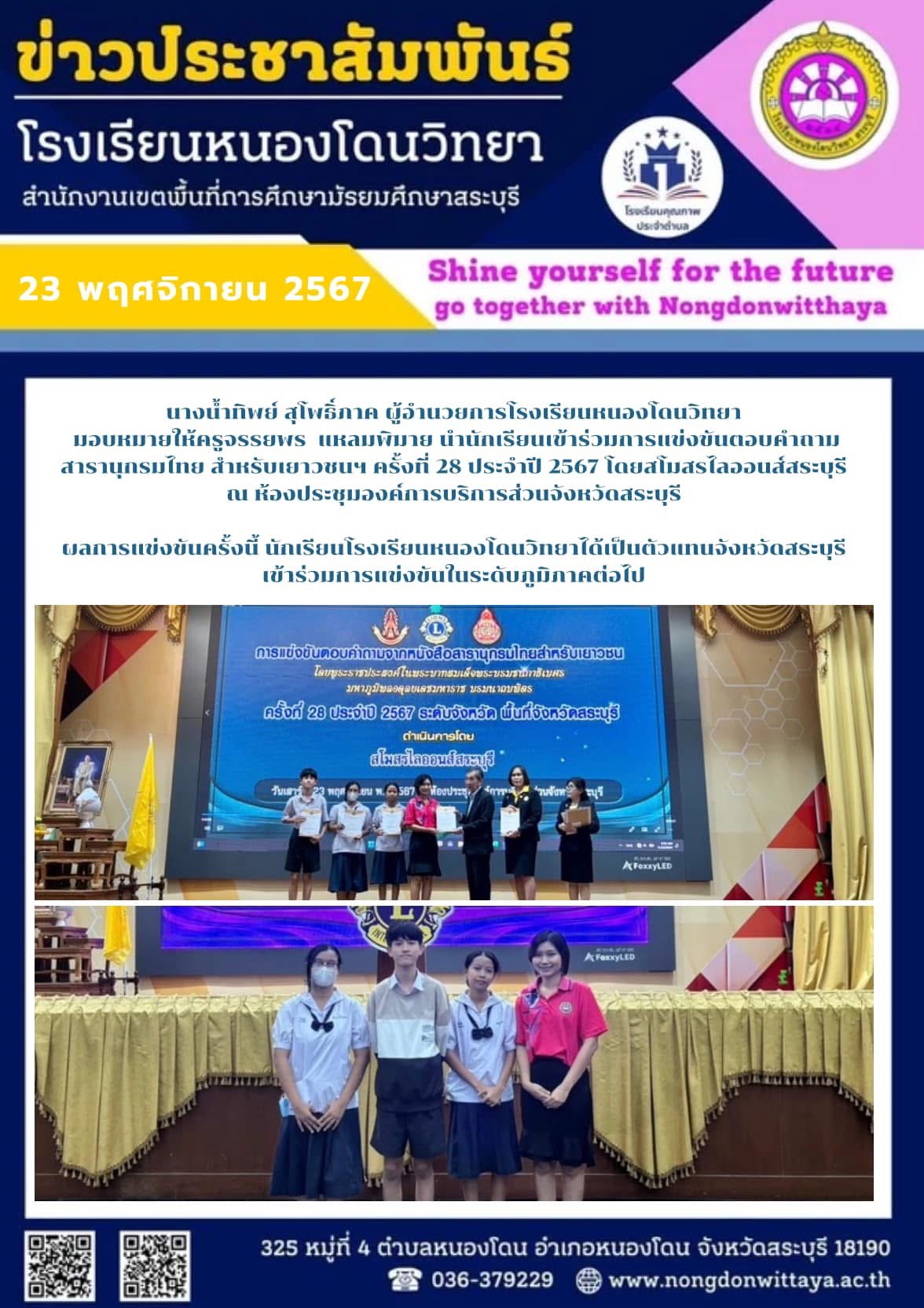 วันที่ 23 พฤศจิกายน 2567 นางน้ำทิพย์ สุโพธิ์ภาค ผู้อำนวยการโรงเรียนหนองโดนวิทยา มอบหมายให้ครูจรรยพร แหลมพิมาย นำนักเรียนเข้าร่วมการแข่งขันตอบคำถามสารานุกรมไทย สำหรับเยาวชนฯ ครั้งที่ 28 ประจำปี 2567 โดยสโมสรไลออนส์สระบุรี ณ ห้องประชุมองค์การบริการส่วนจัง