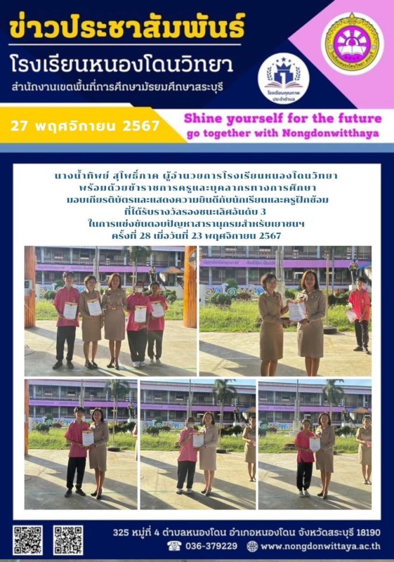 วันที่ 27 พฤศจิกายน 2567 นางน้ำทิพย์ สุโพธิ์ภาค ผู้อำนวยการโรงเรียนหนองโดนวิทยา พร้อมด้วยข้าราชการครูและบุคลากรทางการศึกษามอบเกียรติบัตรและแสดงความยินดีกับนักเรียนและครูฝึกซ้อม ที่ได้รับรางวัลรองชนะเลิศอันดับ 3 ในการแข่งขันตอบปัญหาสารานุกรมสำหรับเยาชนฯ คร