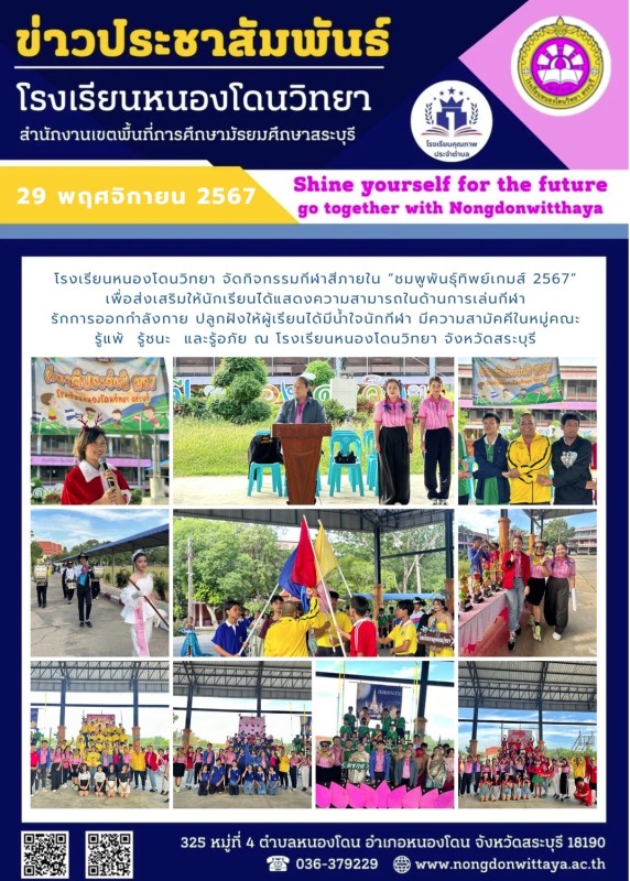 วันที่ 29 พฤศจิกายน 2567 โรงเรียนหนองโดนวิทยา จัดกิจกรรมกีฬาสีภายใน “ชมพูพันธุ์ทิพย์เกมส์ 2567” เพื่อส่งเสริมให้นักเรียนได้แสดงความสามารถในด้านการเล่นกีฬา รักการออกกำลังกาย ปลูกฝังให้ผู้เรียนได้มีน้ำใจนักกีฬา มีความสามัคคีในหมู่คณะ รู้แพ้ รู้ชนะ และรู