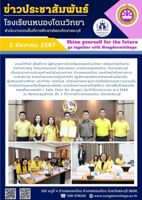 วันที่ 2 ธันวาคม2567 นางน้ำทิพย์ สุโพธิ์ภาค ผู้อำนวยการโรงเรียนหนองโดนวิทยา พร้อมด้วยตัวแทนข้าราชการครู โดยนายณเดชน์ จินดาพรหม นายอำเภอหนองโดน จังหวัดสระบุรี เป็นประธานการประชุมหัวหน้าส่วนราชการฯ อำเภอหนองโดน และหัวหน้าส่วนราชการ ระดับอำเภอ หัวหน้าหน่วยง