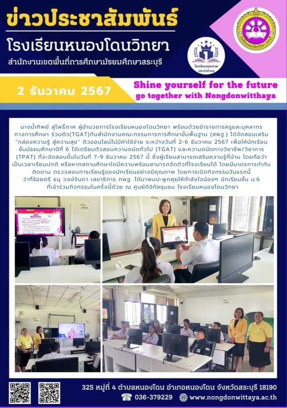วันที่ 2 ธันวาคม 2567 นางน้ำทิพย์ สุโพธิ์ภาค ผู้อำนวยการโรงเรียนหนองโดนวิทยา พร้อมด้วยข้าราชการครูและบุคลากรทางการศึกษา ร่วมติว(TGAT)กับสำนักงานคณะกรรมการการศึกษาขั้นพื้นฐาน (สพฐ.) ได้จัดสอนเสริม “กล่องความรู้ สู่ความสุข” ติวออนไลน์ไม่มีค่าใช้จ่าย ระหว่าง