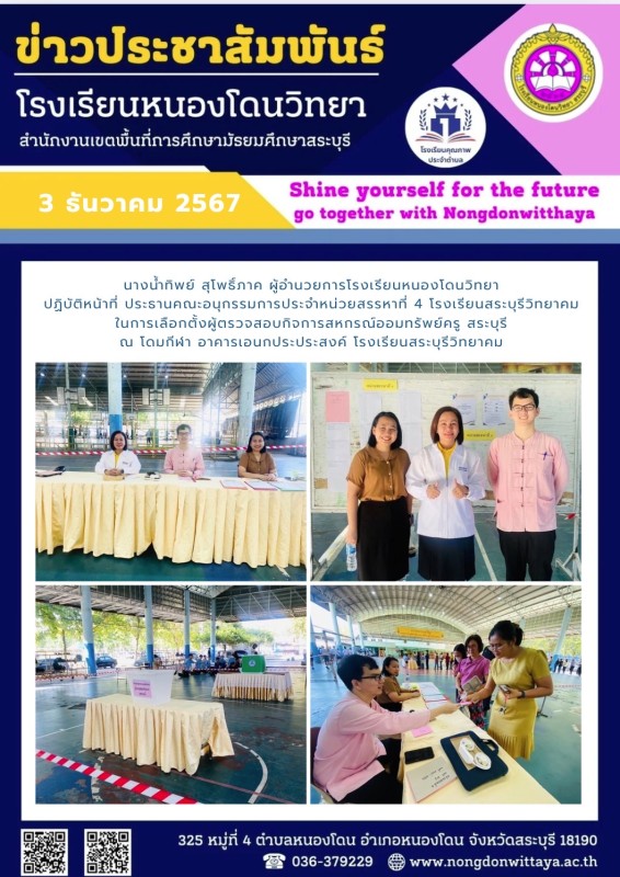 วันที่ 3 ธันวาคม 2567 นางน้ำทิพย์ สุโพธิ์ภาค ผู้อำนวยการโรงเรียนหนองโดนวิทยา ปฏิบัติหน้าที่ ประธานคณะอนุกรรมการประจำหน่วยสรรหาที่ 4 โรงเรียนสระบุรีวิทยาคม ในการเลือกตั้งผู้ตรวจสอบกิจการสหกรณ์ออมทรัพย์ครู สระบุรี ณ โดมกีฬา อาคารเอนกประประสงค์ โรงเรียนสระบ