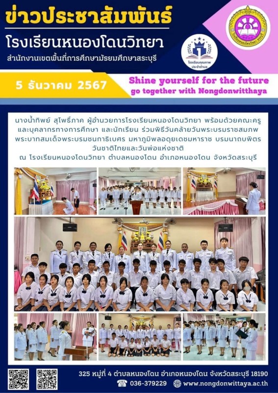 วันที่ 5 ธันวาคม 2567 นางน้ำทิพย์ สุโพธิ์ภาค ผู้อำนวยการโรงเรียนหนองโดนวิทยา พร้อมด้วยคณะครูและบุคลากรทางการศึกษา และนักเรียน ร่วมพิธีวันคล้ายวันพระบรมราชสมภพพระบาทสมเด็จพระบรมชนกาธิเบศร มหาภูมิพลอดุยเดชมหาราช บรมนาถบพิตร วันชาติไทยและวันพ่อแห่งชาติ ณ โ