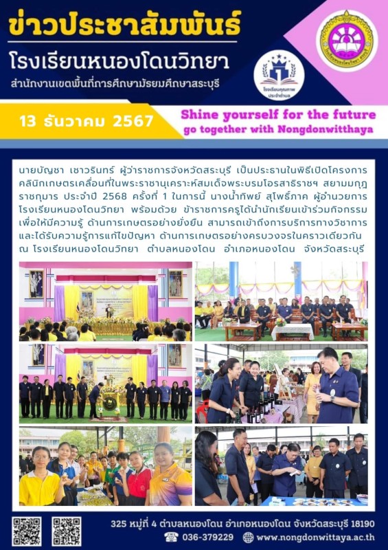 วันที่ 13 ธันวาคม 2567 นายบัญชา เชาวรินทร์ ผู้ว่าราชการจังหวัดสระบุรี เป็นประธานในพิธีเปิดโครงการคลินิกเกษตรเคลื่อนที่ในพระราชานุเคราะห์สมเด็จพระบรมโอรสาธิราชฯ สยามมกุฎราชกุมาร ประจำปี 2568 ครั้งที่ 1 ในการนี้ นางน้ำทิพย์ สุโพธิ์ภาค ผู้อำนวยการโรงเรียนหนอ