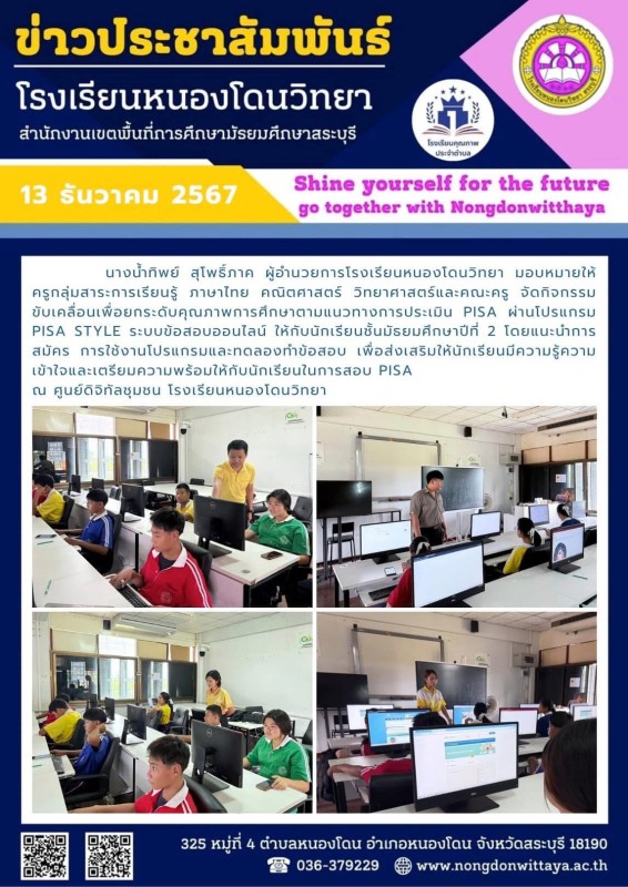 วันที่ 13 ธันวาคม 2567 นางน้ำทิพย์ สุโพธิ์ภาค ผู้อำนวยการโรงเรียนหนองโดนวิทยา มอบหมายให้ ครูกลุ่มสาระการเรียนรู้ ภาษาไทย คณิตศาสตร์ วิทยาศาสตร์และคณะครู จัดกิจกรรมขับเคลื่อนเพื่อยกระดับคุณภาพการศึกษาตามแนวทางการประเมิน PISA ผ่านโปรแกรม PISA STYLE ระบบข