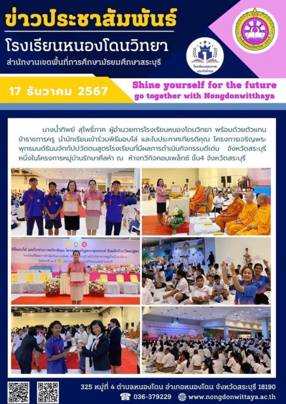 วันที่ 17 ธันวาคม 2567 นางน้ำทิพย์ สุโพธิ์ภาค ผู้อำนวยการโรงเรียนหนองโดนวิทยา พร้อมด้วยตัวแทนข้าราชการครู นำนักเรียนเข้าร่วมพิธีมอบโล่ และใบประกาศเกียรติคุณ โครงการเจริญพระพุทธมนต์ธัมมจักกัปปวัตตนสูตรโรงเรียนที่มีผลการดำเนินกิจกรรมดีเด่น จังหวัดสระบุรี หน