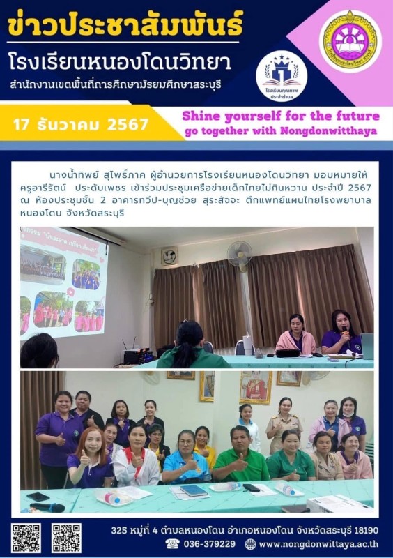 วันที่ 17 ธันวาคม 2567 นางน้ำทิพย์ สุโพธิ์ภาค ผู้อำนวยการโรงเรียนหนองโดนวิทยา มอบหมายให้ ครูอารีรัตน์ ประดับเพชร เข้าร่วมประชุมเครือข่ายเด็กไทยไม่กินหวาน ประจำปี 2567 ณ ห้องประชุมชั้น 2 อาคารทวีป-บุญช่วย สุระสัจจะ ตึกแพทย์แผนไทยโรงพยาบาลหนองโดน จังหวัดส