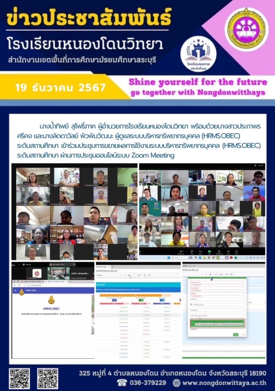 วันที่ 19 ธันวาคม 2567 นางน้ำทิพย์ สุโพธิ์ภาค ผู้อำนวยการโรงเรียนหนองโดนวิทยา พร้อมด้วยนางสาวประภาพร ศรีคง และนางลัดดาวัลย์ พัวพันวัฒนะ ผู้ดูแลระบบบริหารทรัพยากรบุคคล (HRMS.OBEC) ระดับสถานศึกษา เข้าร่วมประชุมการขยายผลการใช้งานระบบบริหารทรัพยากรบุคคล (HRMS