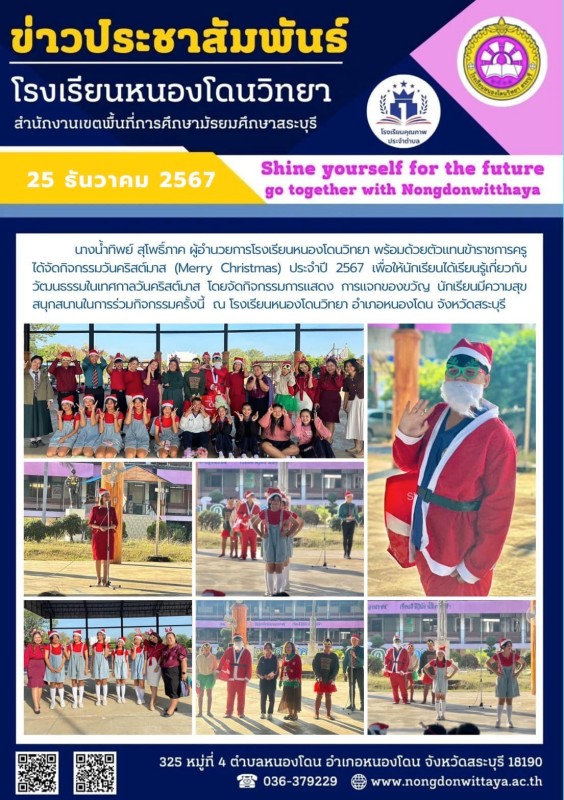 วันที่ 25 ธันวาคม 2567 นางน้ำทิพย์ สุโพธิ์ภาค ผู้อำนวยการโรงเรียนหนองโดนวิทยา พร้อมด้วยตัวแทนข้าราชการครู ได้จัดกิจกรรมวันคริสต์มาส (Merry Christmas) ประจำปี 2567 เพื่อให้นักเรียนได้เรียนรู้เกี่ยวกับวัฒนธรรมในเทศกาลวันคริสต์มาส โดยจัดกิจกรรมการแสดง การแจก