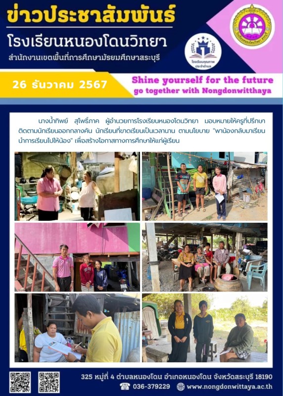 วันที่ 26 ธันวาคม 2567 นางน้ำทิพย์ สุโพธิ์ภาค ผู้อำนวยการโรงเรียนหนองโดนวิทยา มอบหมายให้ครูที่ปรึกษาติดตามนักเรียนออกกลางคัน นักเรียนที่ขาดเรียนเป็นเวลานาน ตามนโยบาย "พาน้องกลับมาเรียน นำการเรียนไปให้น้อง" เพื่อสร้างโอกาสทางการศึกษาให้แก่ผู้เรียน