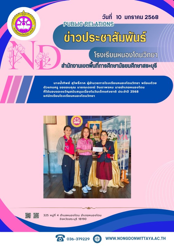 วันที่ 10 มกราคม 2568 นางน้ำทิพย์ สุโพธิ์ภาค ผู้อำนวยการโรงเรียนหนองโดนวิทยา พร้อมด้วยตัวแทนครู ขอขอบคุณ นายณเดชณ์ จินดาพรหม นายอำเภอหนองโดน ที่ได้มอบของขวัญสนับสนุนเนื่องในวันเด็กแห่งชาติ ประจำปี 2568 แก่นักเรียนโรงเรียนหนองโดนวิทยา