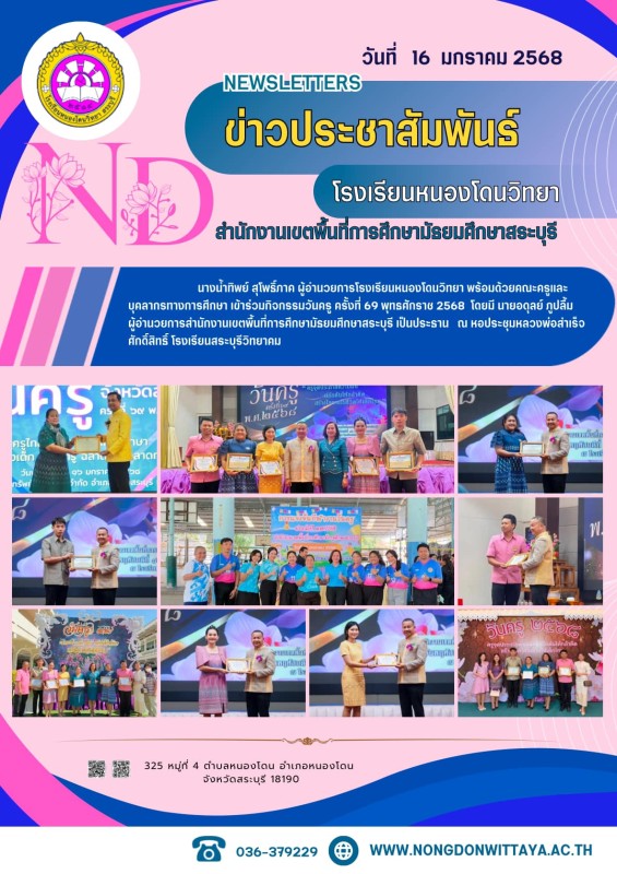 วันที่ 16 มกราคม 2568 นางน้ำทิพย์ สุโพธิ์ภาค ผู้อำนวยการโรงเรียนหนองโดนวิทยา พร้อมด้วยคณะครูและบุคลากรทางการศึกษา เข้าร่วมกิจกรรมวันครู ครั้งที่ 69 พุทธศักราช 2568 โดยมี นายอดุลย์ ภูปลื้ม ผู้อำนวยการสำนักงานเขตพื้นที่การศึกษามัธยมศึกษาสระบุรี เป็นประธาน ณ