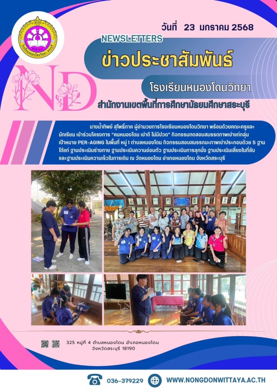 วันที่ 23 มกราคม 2568 นางน้ำทิพย์ สุโพธิ์ภาค ผู้อำนวยการโรงเรียนหนองโดนวิทยา พร้อมด้วยคณะครูและนักเรียน เข้าร่วมโครงการ “คนหนองโดน เข่าดี ไม่มีปวด” กิจกรรมทดสอบสมรรถภาพเข่าแก่กลุ่มเป้าหมาย Per-aging ในพื้นที่ หมู่ 1 ตำบลหนองโดน กิจกรรมสอบสมรรถนะภาพเข่าประ