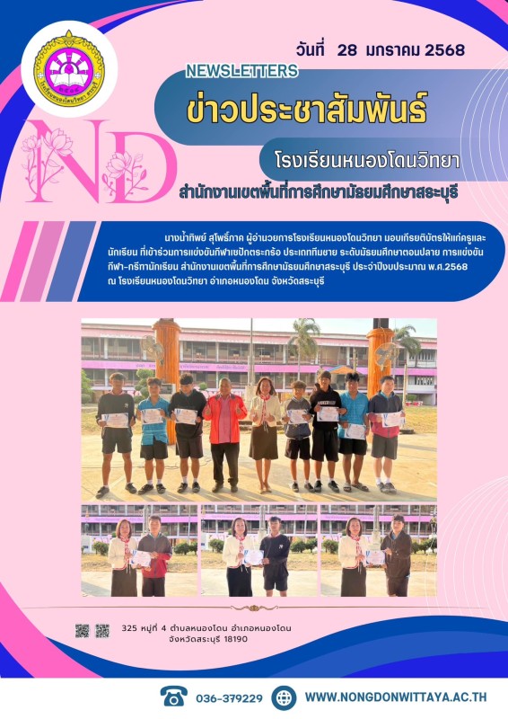วันที่ 28 มกราคม 2568 นางน้ำทิพย์ สุโพธิ์ภาค ผู้อำนวยการโรงเรียนหนองโดนวิทยา มอบเกีรยติบัตรให้แก่ครูและนักเรียน ที่เข้าร่วมการแข่งขันกีฬาเซปักตระกร้อ ประเถททีมชาย ระดับมัธยมศึกษาตอนปลาย การแข่งขันกีฬา-กรีฑานักเรียน สำนักงานเขตพื้นที่การศึกษามัธยมศึกษาสระบ