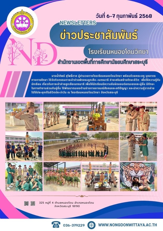 วันที่ 6-7 กุมภาพันธ์ 2568 นางน้ำทิพย์ สุโพธิ์ภาค ผู้อำนวยการโรงเรียนหนองโดนวิทยา พร้อมด้วยคณะครู บุคลากรทางการศึกษา ได้จัดกิจกรรมการเข้าค่ายพักแรมลูกเสือ–เนตรนารี ค่ายเสริมสร้างทักษะชีวิต เพื่อให้ความรู้กับนักเรียน เกี่ยวกับการเข้าค่ายลูกเสือเนตรนารี เพื